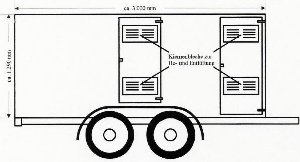 2000 kg-Tandem-Gummifederachse mit Einzelradfederung; 18 mm wasserfestverleimte Phenolharzfilm-Mehrschichtplatten (Farbe braun); Doppelstöcker; abgerundete Kotflügel; Siebdruckboden; Einstiegstüren; 10 Kiemenbleche für die Lüftung der Boxen; verzinkte Gitterinnentüren; Stützrad; Tüv-Abnahme wahlweise für Fahrzeugbrief oder Betriebserlaubnis